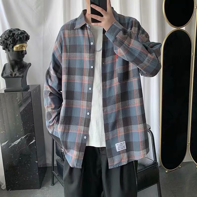 秋の格子シャツ男性長袖ファッション韓国版香港風ins文芸カジュアルゆったりシャツ上着コート