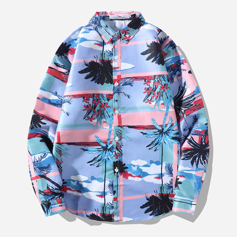香港風レトロプリント長袖シャツ男chi港味上着デザイン感春秋外着ビーチ風シャツ