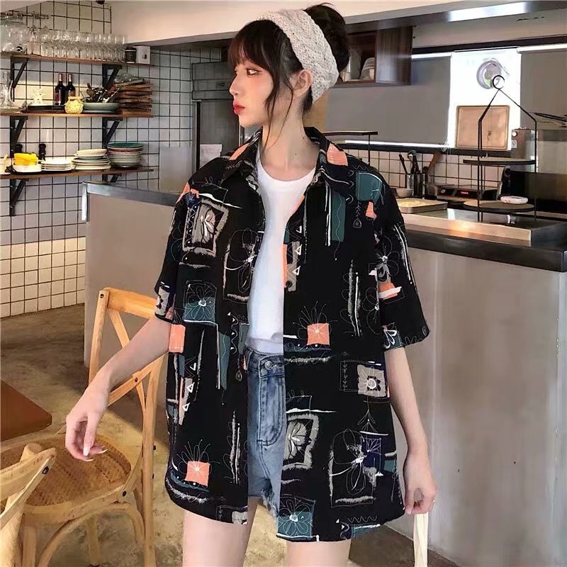 2022種類の夏の幾何学的レトロなプリントシャツカップルのデザイン感のある小さな上着のゆるいカジュアルな半袖シャツ