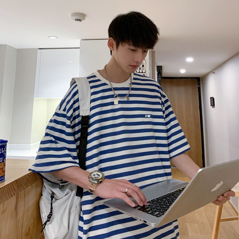 夏の潮牌痞帅爆街服2022デザイン感学生5五分袖ゆるい縞半袖tシャツ男