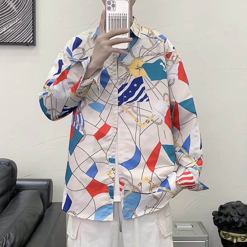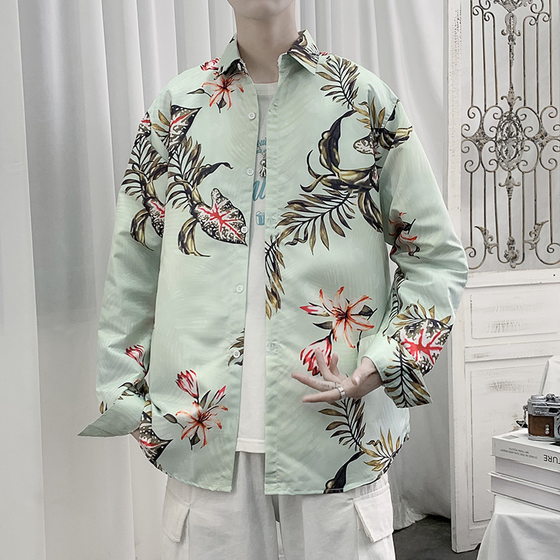 日本系原宿風長袖花シャツ男春夏香港風ゆるいカジュアルレトロ男性ごろつきシャツコート