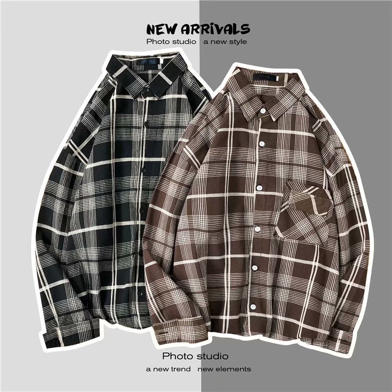春と秋のシャツの男性の韓国版のファッションのカジュアルでゆったりしている長袖のシャツの香港風の百合のカップルの復古の格子のコート