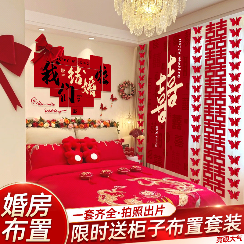 結婚式の部屋の装飾、結婚式のレイアウトセット、男性と女性の新しい家のベッドルームのベッドサイドの背景壁のラテアートのフルセット、雰囲気