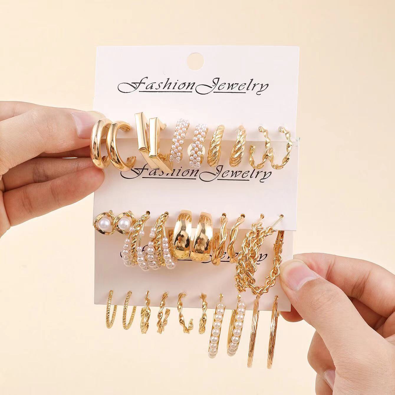 欧米国境を越えた合金真珠耳輪幾何形耳飾りセット6点セットファッション個性誇張ピアスイヤリング