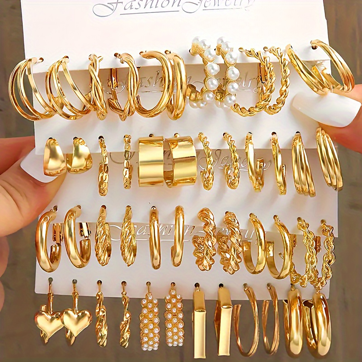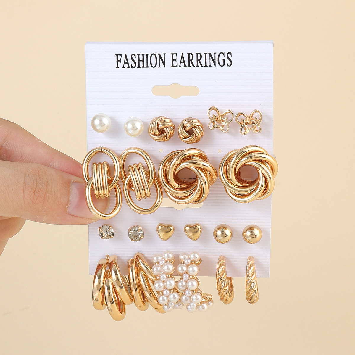 ヴィンテージゴールドイヤリングセット、イヤリング24個セット、欧米風クロスボーダーフレンチスタイル幾何学模様パールイヤリング卸売