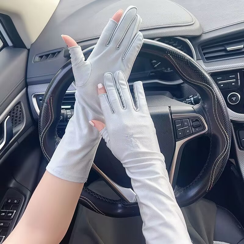 クロスボーダーの新型刺繍の中の長いスパンデックスの手袋の女性の薄い金の漏れの2本の指の氷の糸の日焼け止めの夏の車を運転して騎乗します。