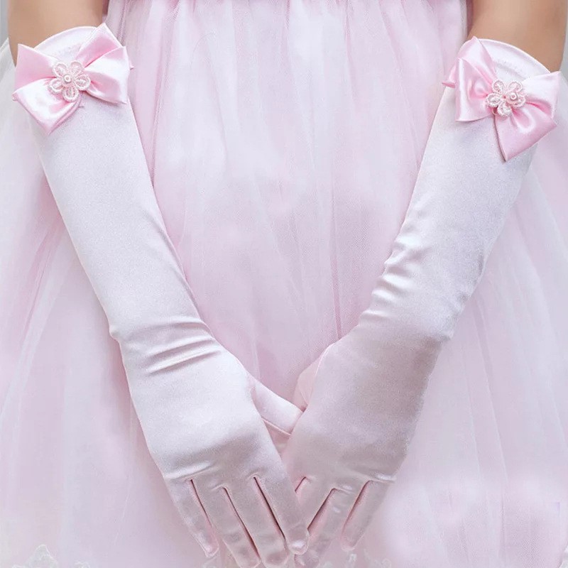 クロスボーダー版子供の色の蝶結びの手袋のサテンの幼稚園の舞踏会は礼儀の服装の花の子供の長い手袋を演じます。