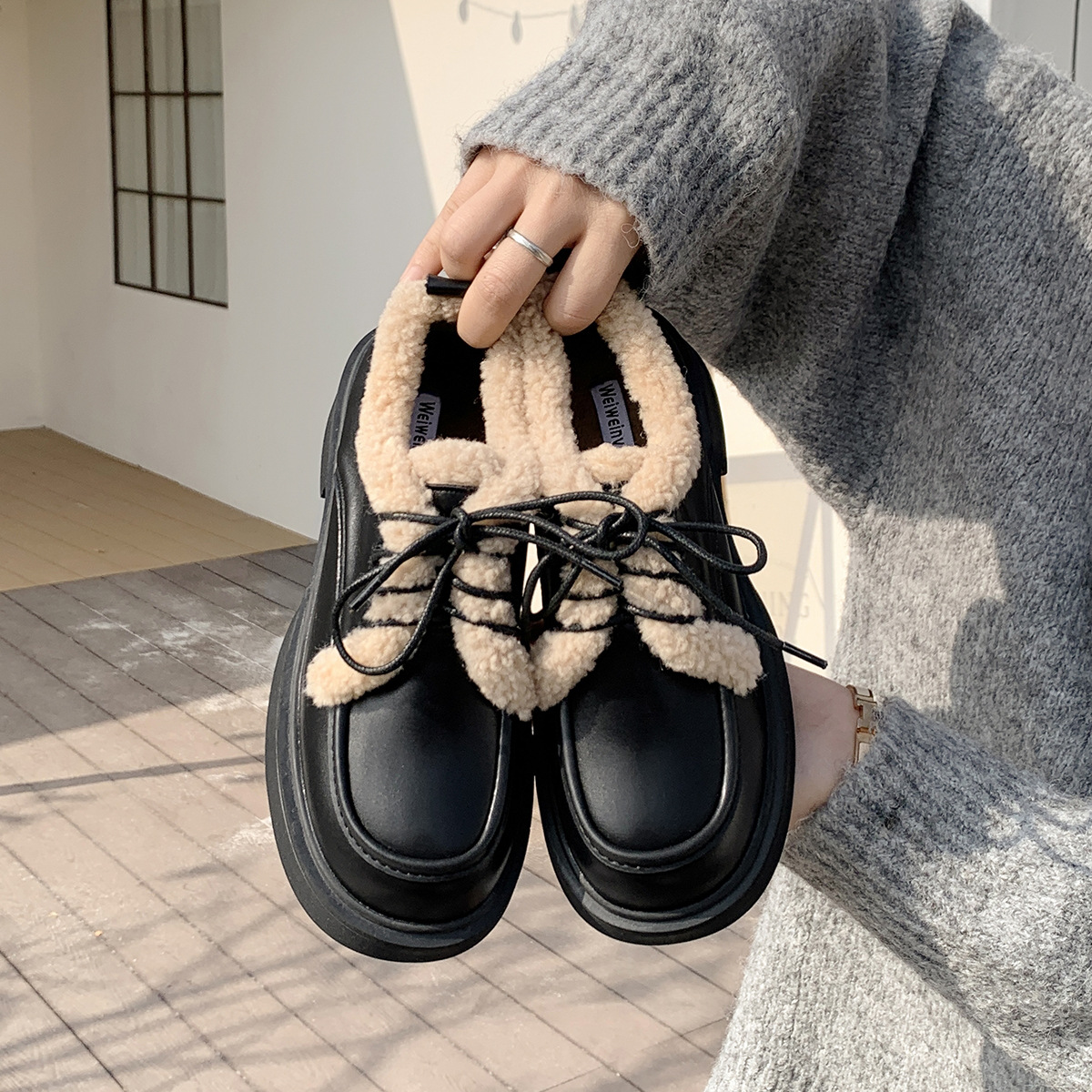 威威の女の人の75-92厚い底の楽福の靴の女性の復古の英倫風の靴の女性のひもはベルベットと毛の小さい革靴をプラスします。