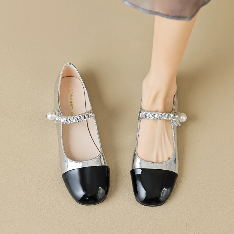 威威の女の128-1の丸い頭のメアリー珍の靴の女性のフランスの1字はチェーンの真珠の小さい香の風の平の靴を持ちます。