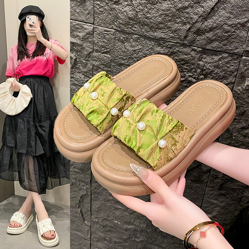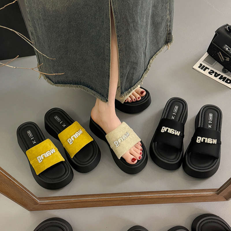 ドリルのスリッパ付きの女性は夏に2025の新しい松餅の厚い底を着て、アンドロメダ風が糞を踏んで涼しくなった