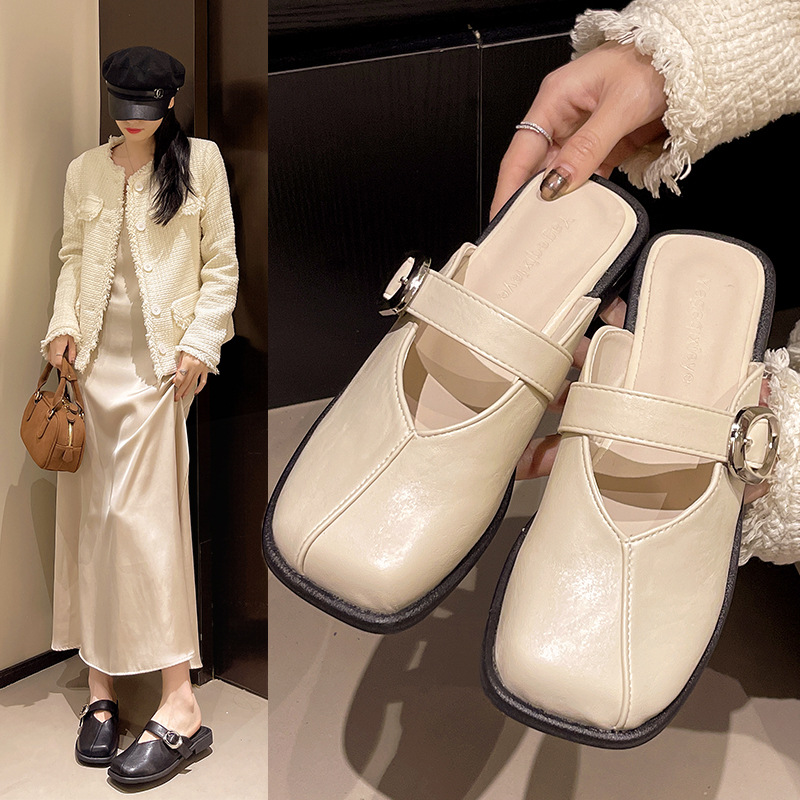 女性が外で履くための包頭ハーフスリッパ 2025 春の新しいスクエアトゥレトロインターネット有名人のヒールレスオフィスサンダル
