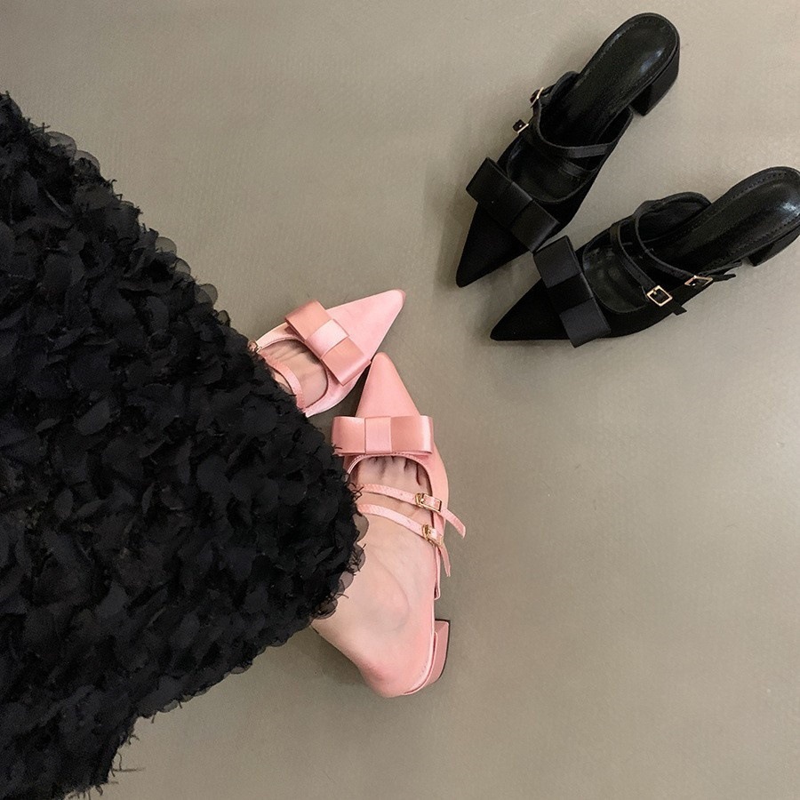 厚底フレンチリボンつま先ハーフスリッパ婦人靴アウター2025新作夏ポインテッドトゥメリージェーンサンダル