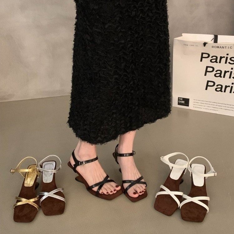 坂とサンダルの女性は2025夏の新しいフランスのレトロな一字のボタンを着てハイヒールをつけて疲れないローマ靴を履いている