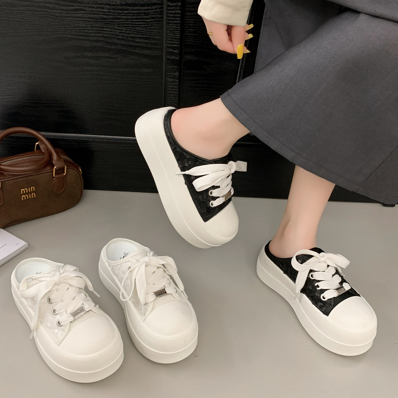 キャンバスの包頭の半分のスリッパの女性のタイプ2025新型の外は1足の怠け者の靴を履いて高くなります。