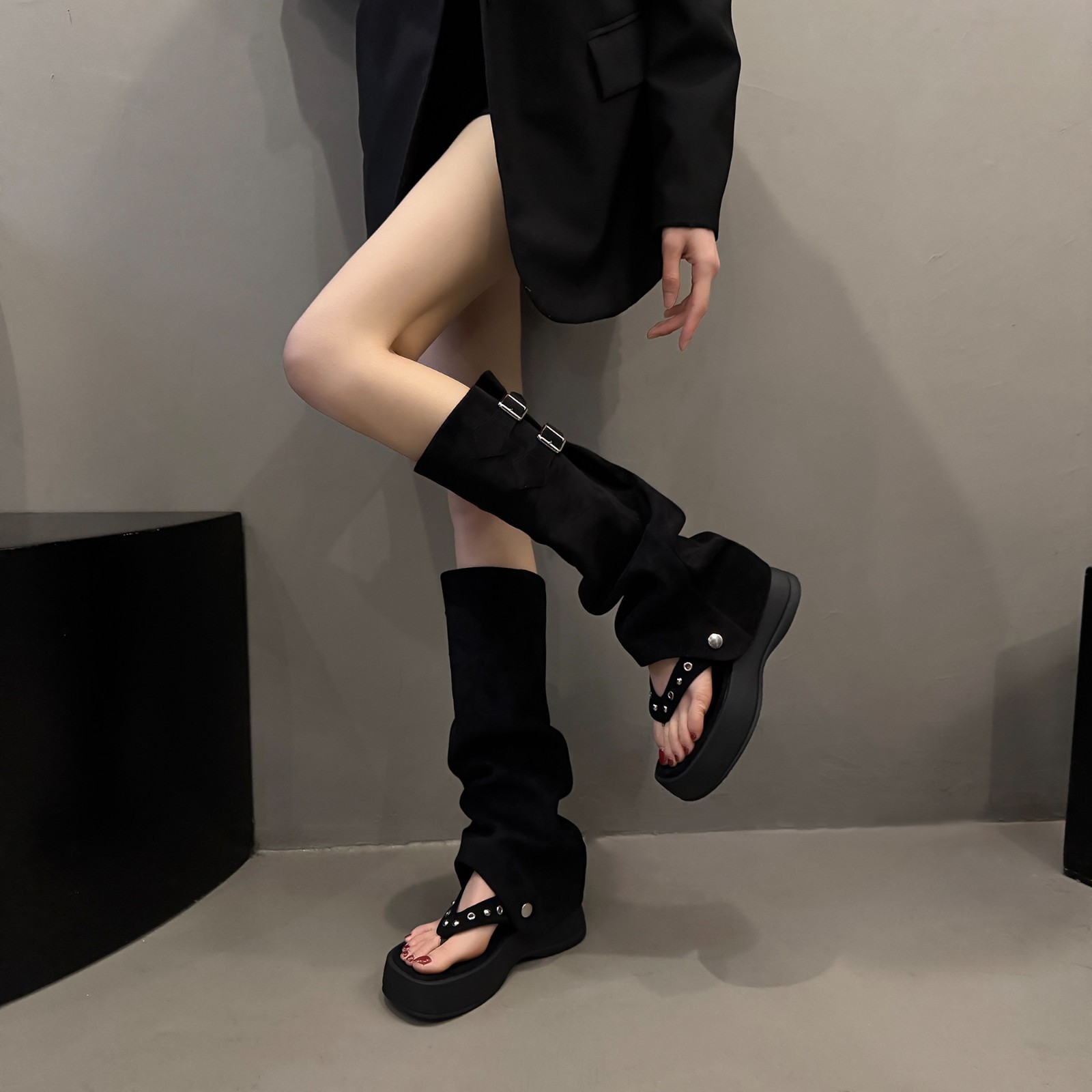 レトロなツーウェアトングトゥパイルブーツ女性用 2025 夏の新しい厚底ヘリンボーンハイローマンサンダルパンツブーツトレンディ