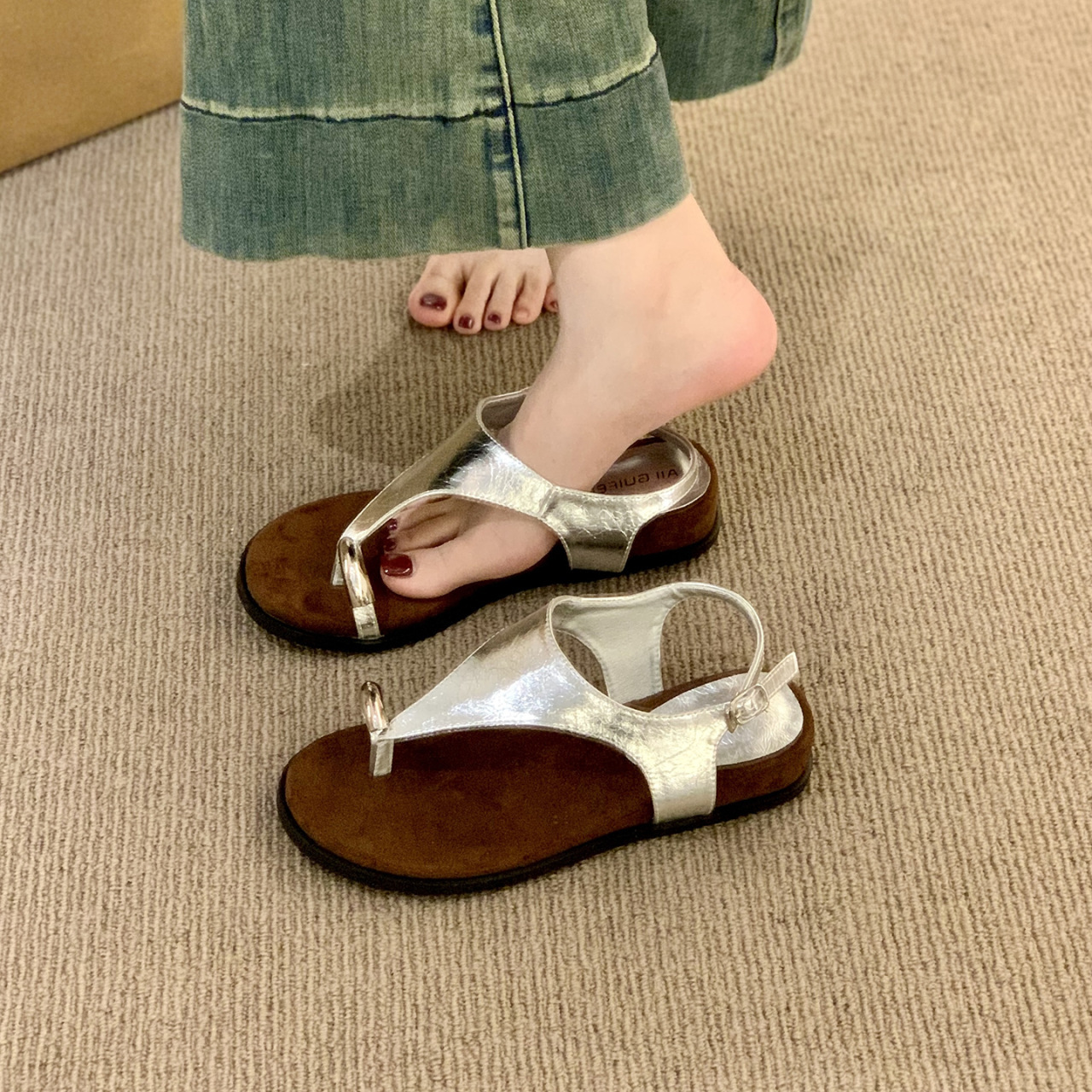 フレンチソフトレザーヘリンボーントングサンダル女性用 2025 夏新作ソフトフラットサンダルルーズスリーブチューブショートブーツ