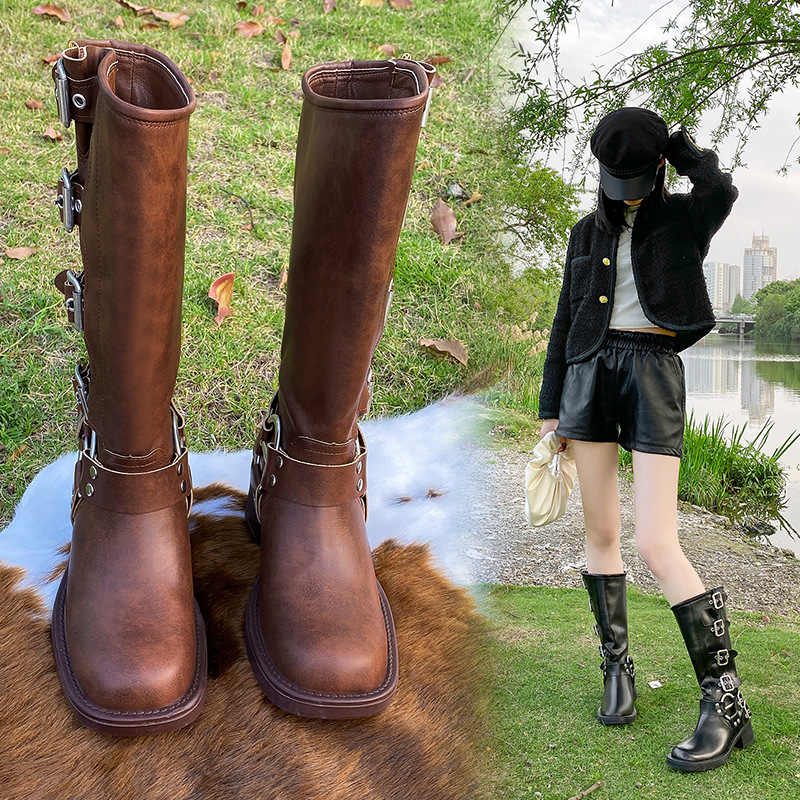 ブラウンウエスタンカウボーイブーツ女性用2025夏新作太ヒールマーティンブーツオーバーニーブーツハイライダーブーツ