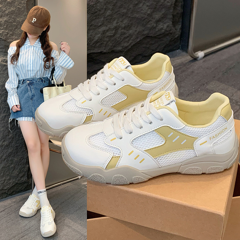 女性のための厚底レザーメッシュ白靴 2025 新作春夏メッシュ通気性カジュアルスニーカー黄色フォレスト・ガンプ靴