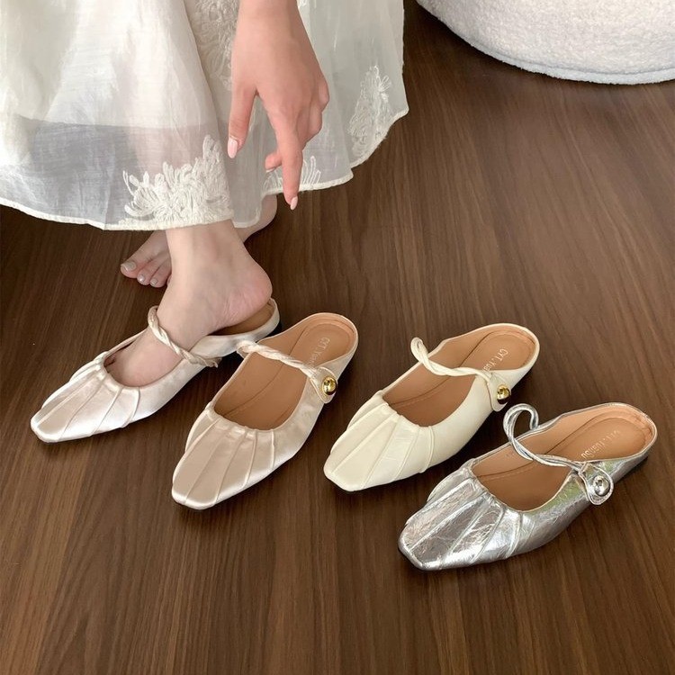 夏用女性用フレンチサテントゥハーフスリッパ、高級メリージェーンシューズ、ミュールシューズ、フェアリースタイルサンダル