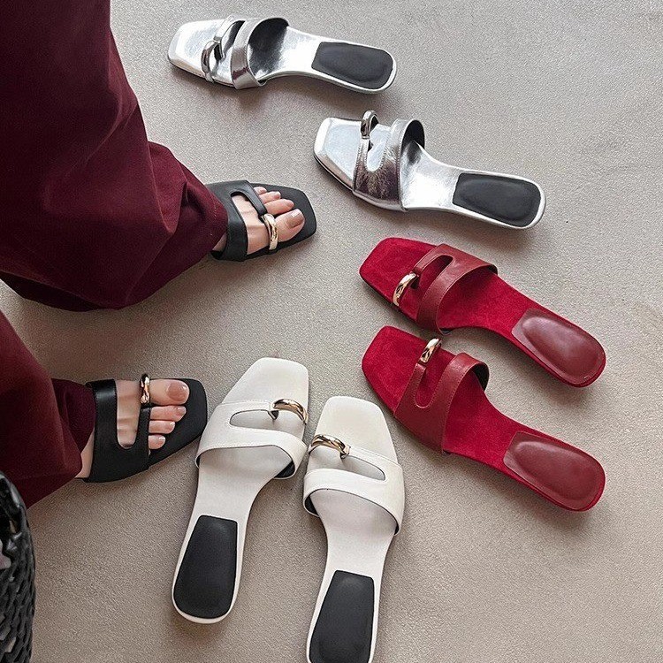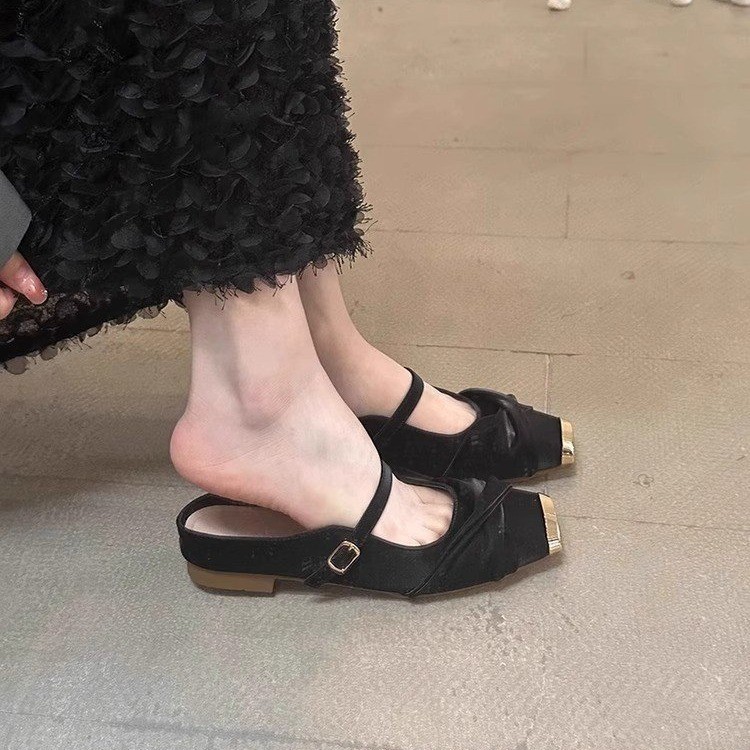 メタルスクエアトゥフラットヒールハーフスリッパ女性用 2025 春夏新作ソフトソールスリッパアウターメリージェーンシューズ