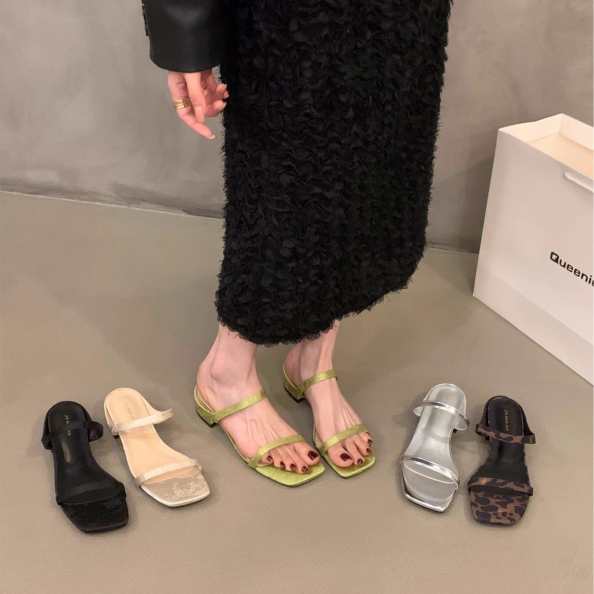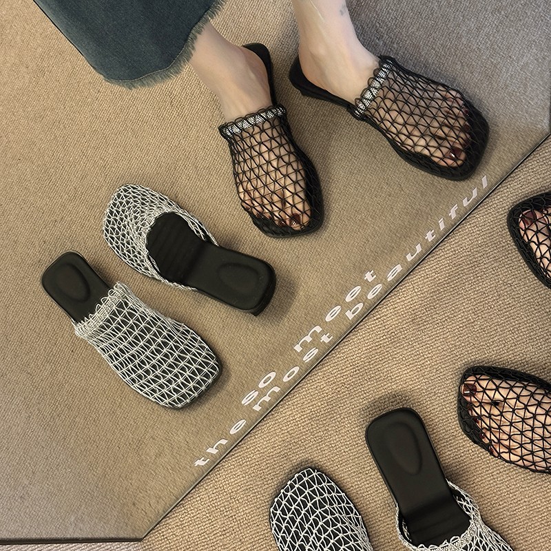 フレンチローヒール網タイツシューズメッシュ中空つま先ハーフスリッパ女性の夏のアウターウェア 2025 新しいホールサンダル