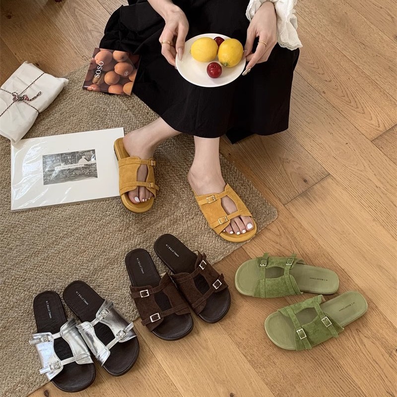 2025 新しい夏のデザインオープントゥフラットシューズ女性のためのメタルバックルスプリットトゥスリッパフレンチスタイルサンダル女性のための