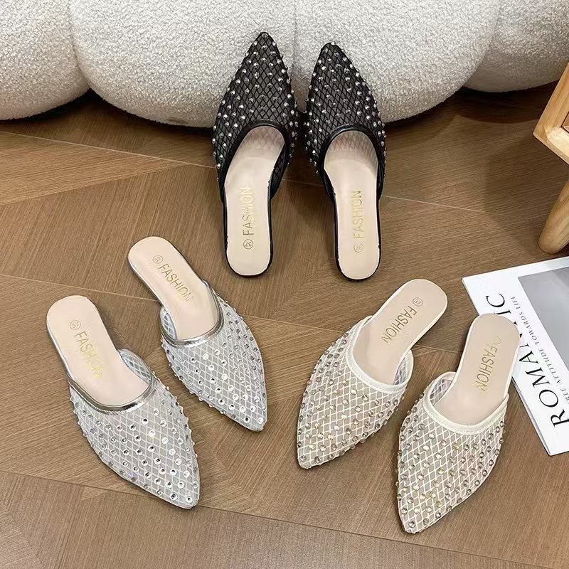 女性がスカートとメッシュの太いヒールとハーフスリッパを履くためのファッショナブルなラインストーンのフラットトゥトゥスリッパ2025春夏セレブスタイル