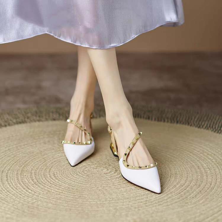 2025年新作フレンチスタイルのポインテッドトゥの浅い口の細いヒールのハイヒール、ファッショナブルなワンラインメタルバックオープントゥサンダル