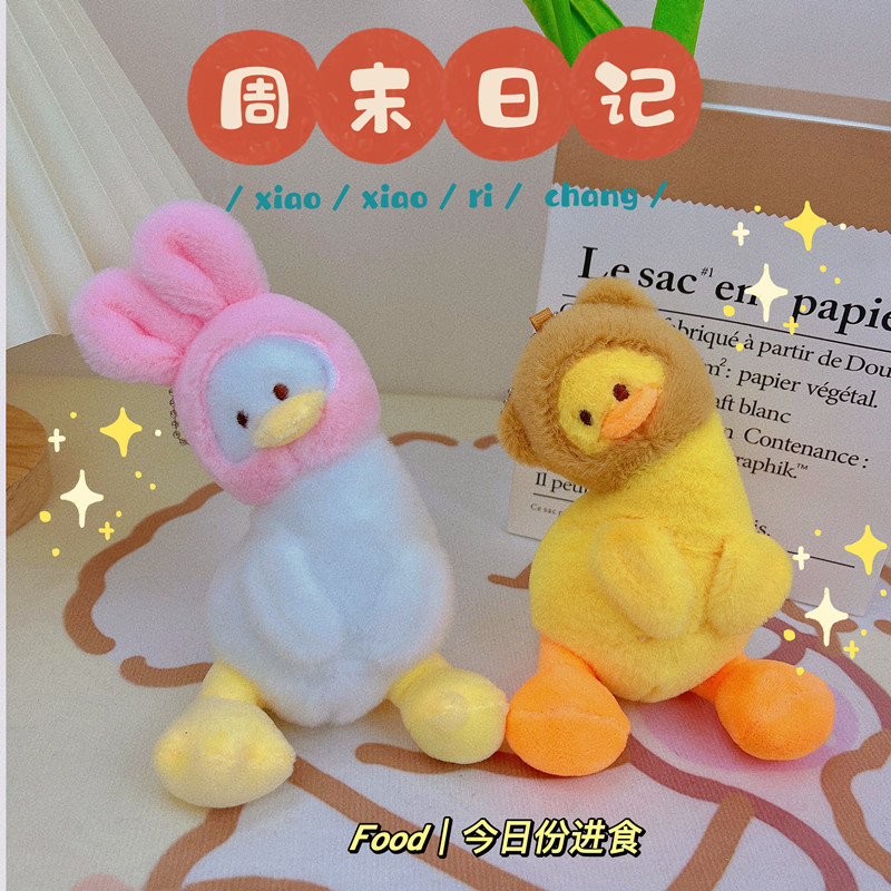 ぬいぐるみの頭が首をかしげているアヒルのキーホルダーがかわいい車の飾りをつけているアヒルのバッグがカップルを飾っている