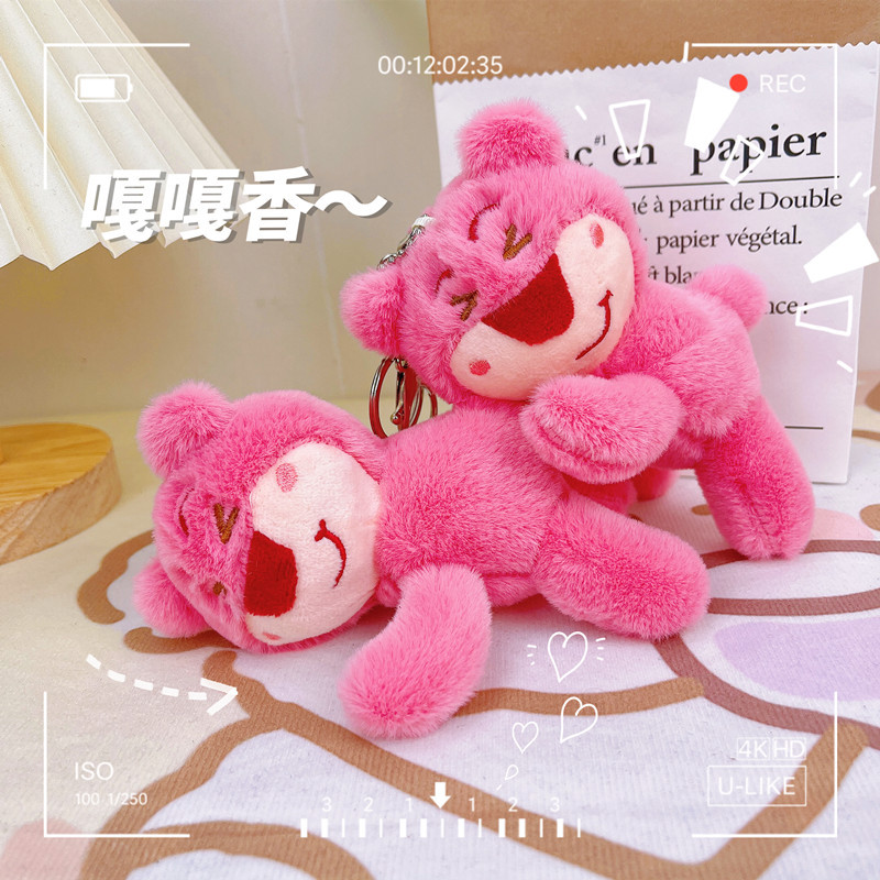 ぬいぐるみがうつ伏せになっている姿が目を細めているいちご熊のキーホルダー