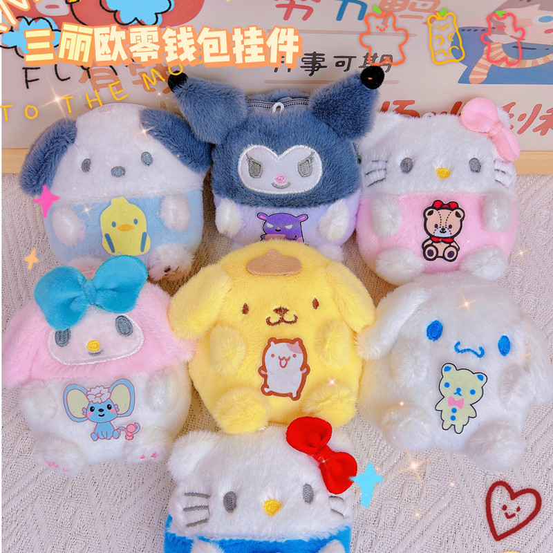 サンリオの小銭入れのキーホルダーが可愛いぬいぐるみのリュックサックに飾られています。
