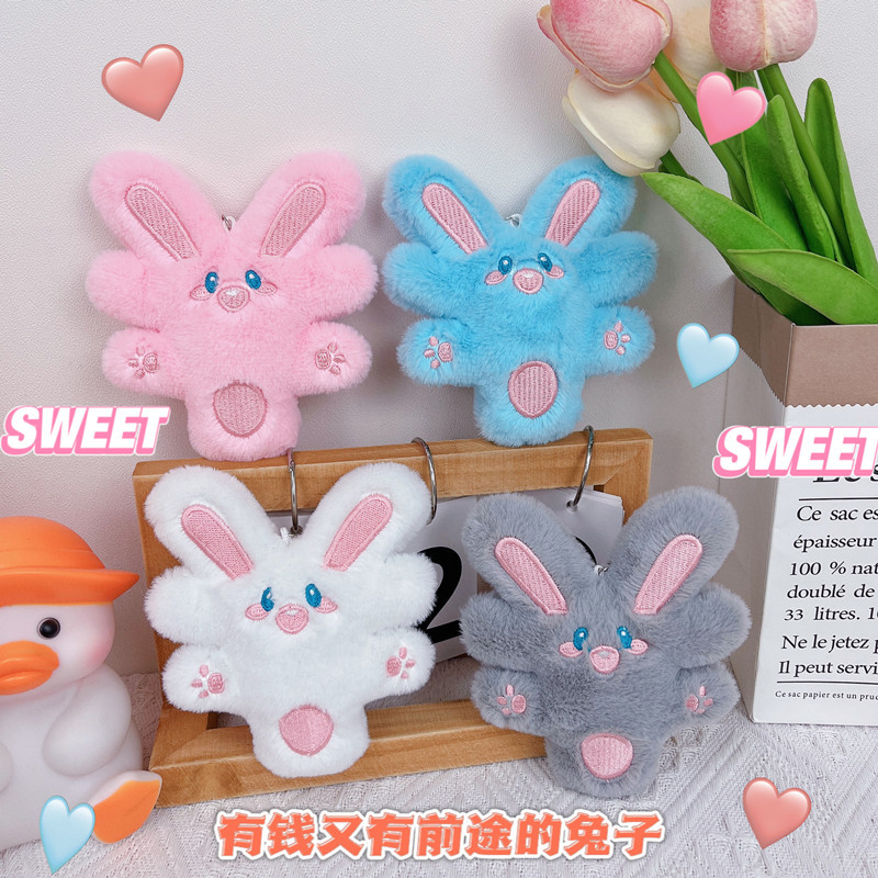 お金持ちのウサギのペンダントが可愛いぬいぐるみのキーホルダーのウサギのバッグに飾られています。