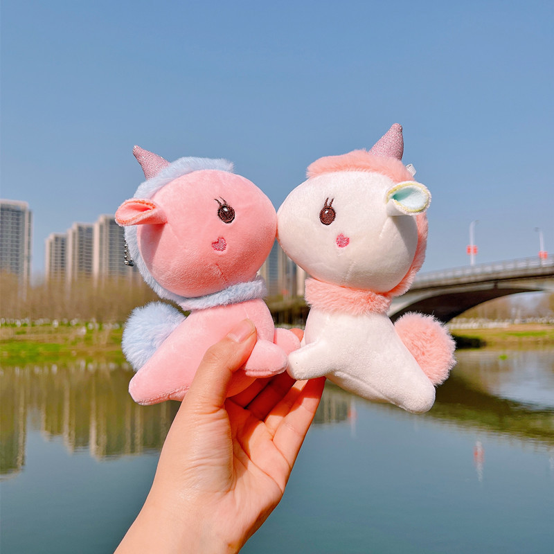 超柔らかいぬいぐるみユニコーンのキーホルダーがかわいい少女の心が腹ばいになっている姿に飾られたバッグが飾られている
