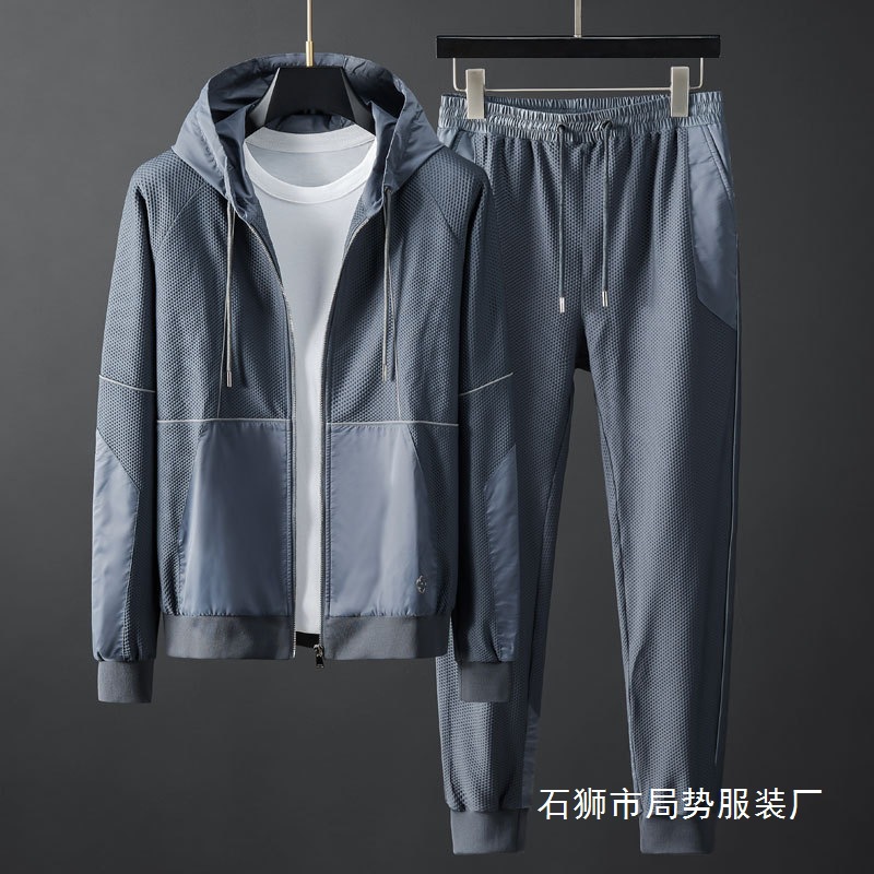 2025春秋新型スポーツレジャースーツ男性ハニカムメッシュ弾力スリムフード付きファッション2点セットブーム