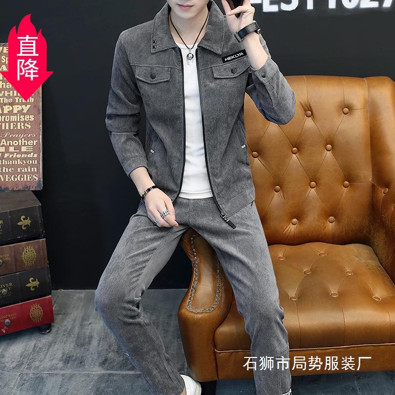 男性スーツ2点セット秋冬新作ファッションコーデュロイ長ズボンカジュアルスーツ男性用コート折り襟メンズ