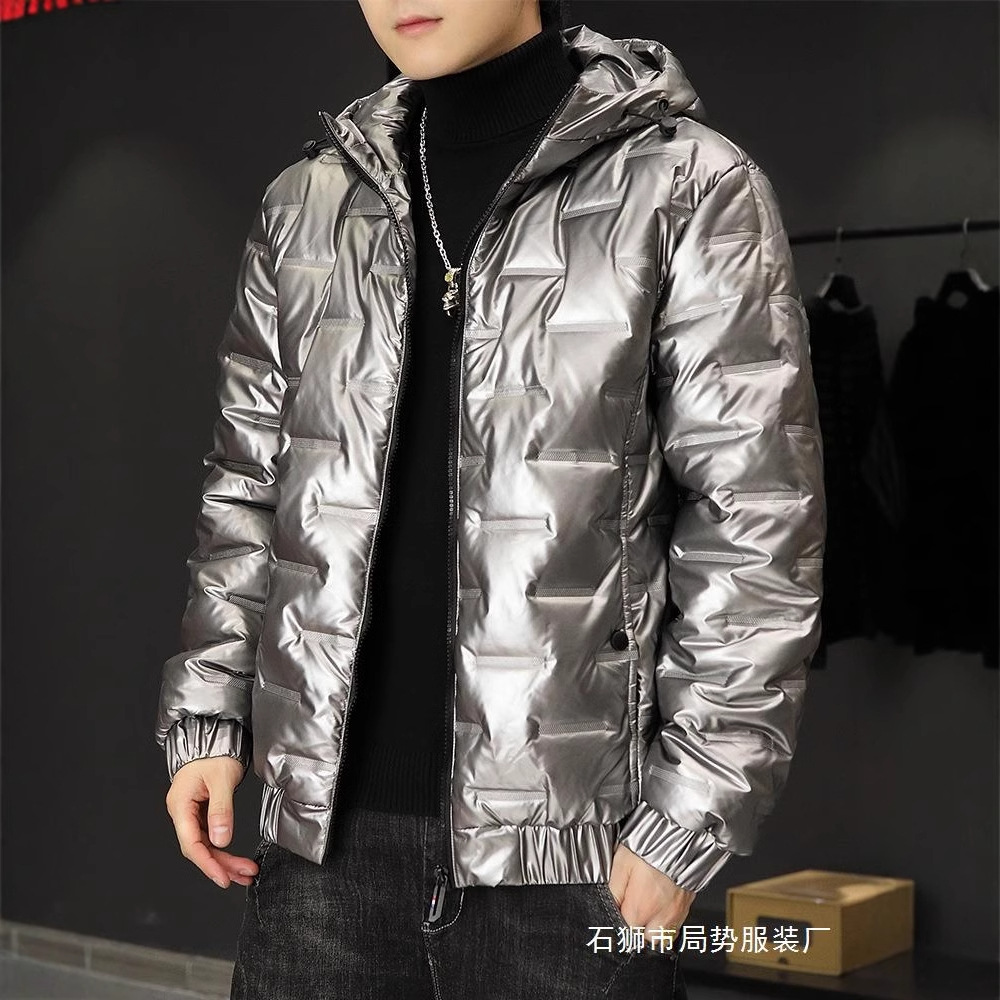 2024冬の紳士服の新型帽子付き綿服の流行カジュアルな明るい面の短い綿入れのダウンジャケットの男性服