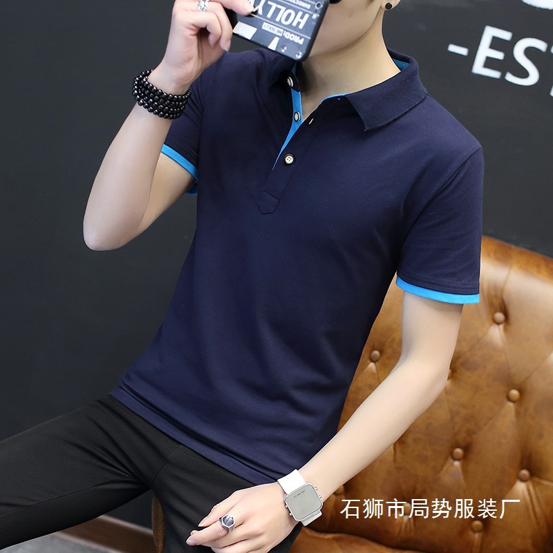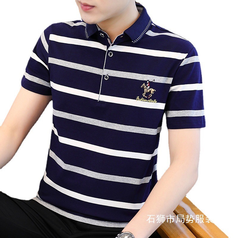 メンズ半袖tシャツ新品夏ポロシャツトレンドかっこいいゆるい折り襟半袖トップス青年ストライプtシャツ