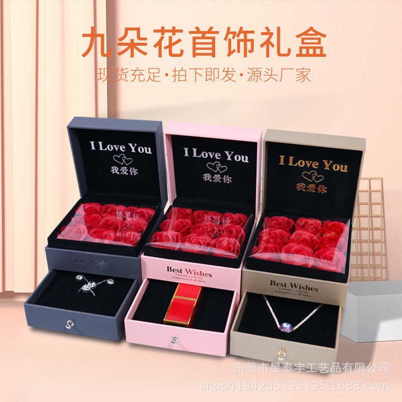 9つのバラのバレンタインデーのギフトボックスの石鹸の花の二重の引き出しのネックレスのイヤリングの指輪の口紅のアクセサリーの箱のプレゼント