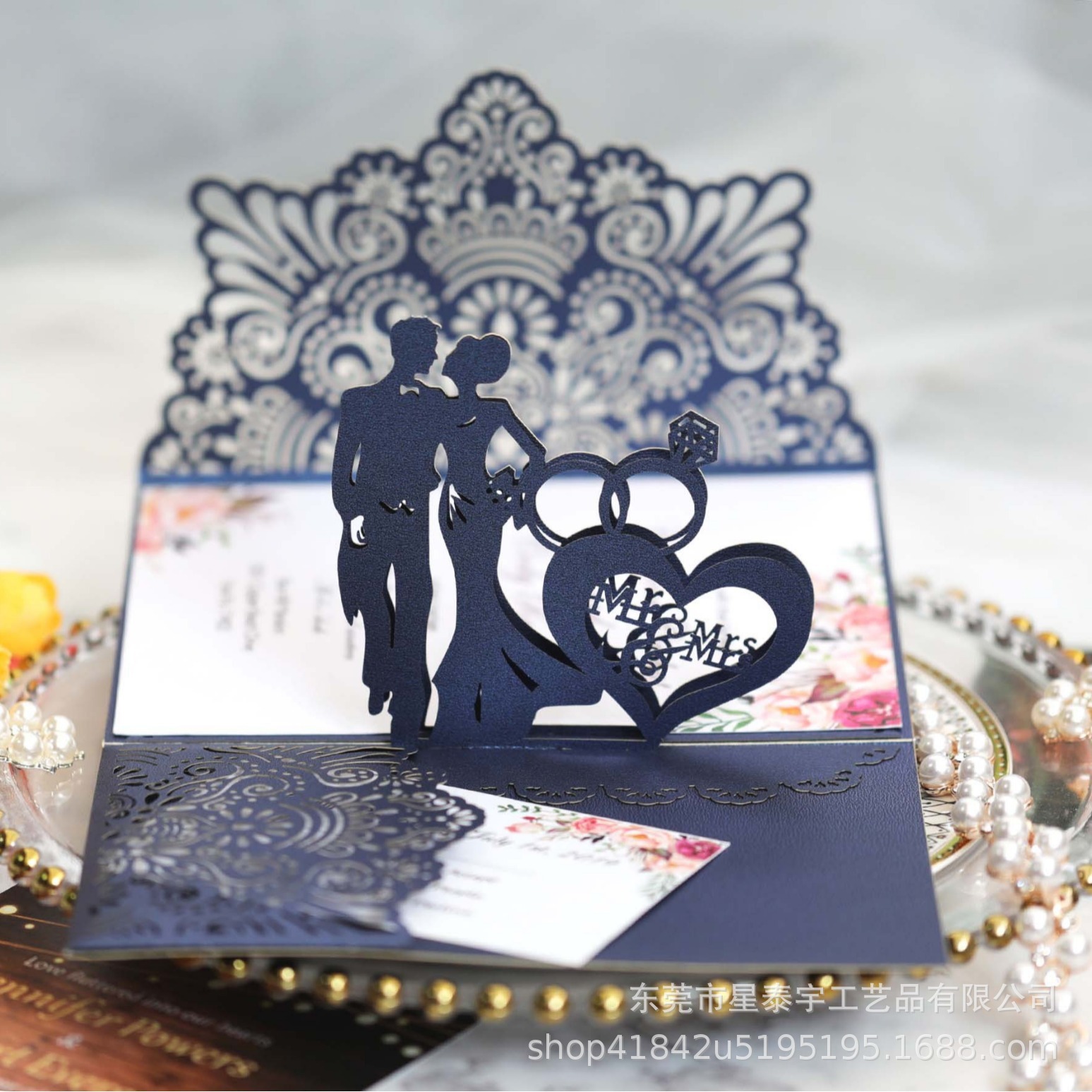 新商品の立体招待状のレーザー透かし彫りの祝福カードの結婚祝いの深蘭色の結婚ビジネスカードの浙江卸売り