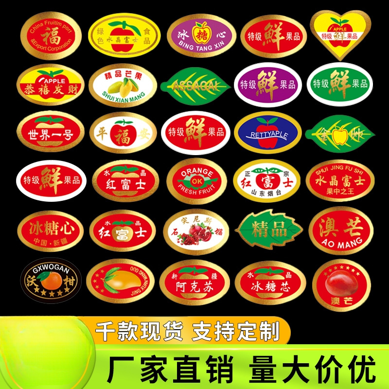 金箔加工の汎用オレンジ、梨、マンゴー、バナナ、ザクロ、フルーツ用不乾性ラベル、アップルラベルステッカー、カスタムメイド
