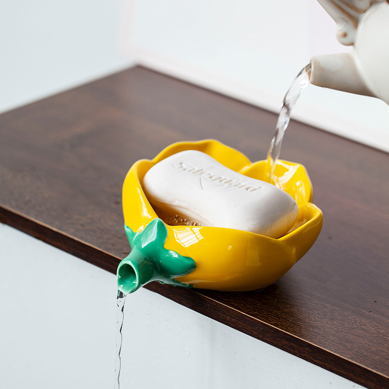 石鹸の皿の陶磁器の花びらの石鹸の箱は水が溜まっていません。