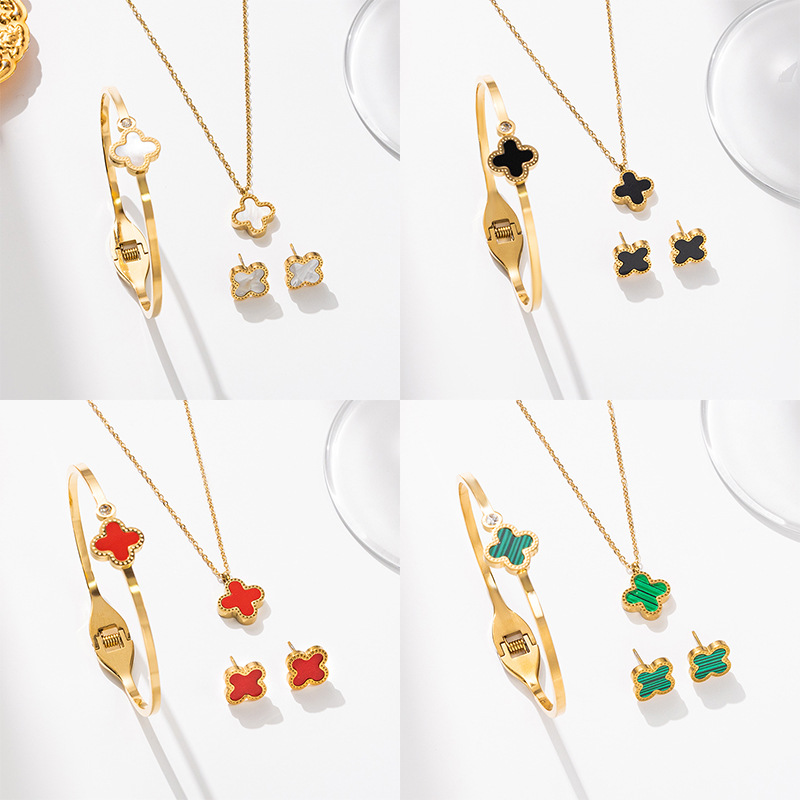 クロスボーダーメッキ18k金ステンレス四葉草セットファッション百合ネックレスブレスレットピアス3点セット卸売り