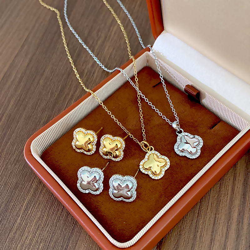 クロスボーダー新商品 四つ葉のクローバーセット チタン鋼ネックレス レディース イヤリング おしゃれで多用途なデザイン 鎖骨チェーン ライトラグジュアリーアクセサリー
