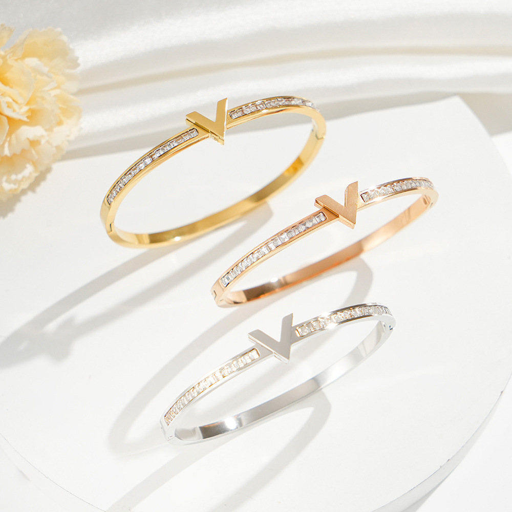チタン鋼色保持 V 文字フルダイヤモンドブレスレット女性のためのシンプルな気質バックルブレスレット多用途ライト高級クロスボーダーホット販売ハンドジュエリー