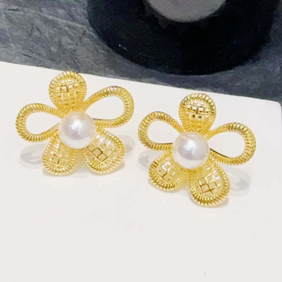 新しいシンプルでファッショナブルな韓国の絶妙な中空フラワーイヤリングレトロ多用途ライト高級ハイエンドパールイヤリング女性用