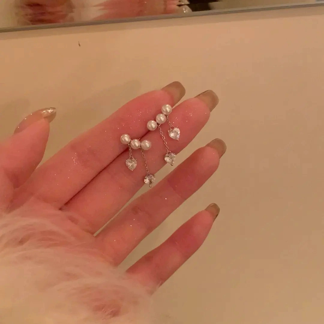 925 シルバー針非対称ラブジルコンタッセルパールイヤリングフレンチロマンチックな絶妙な小さな香りの絶妙なイヤリング