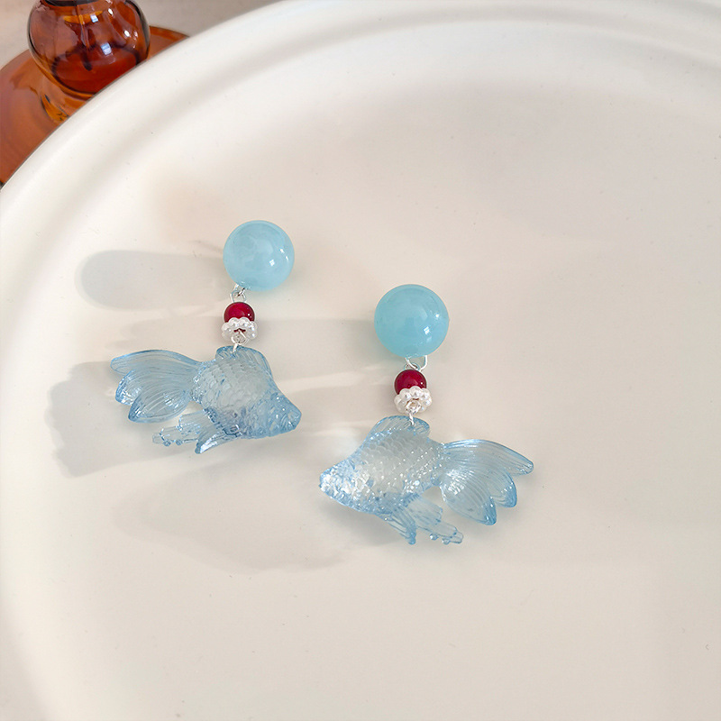 クリア金魚ペンダントイヤリングブルー透明イヤリング女性の夏の海辺の休暇スタイルの愛の真珠ビーズイヤリング