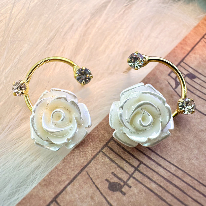 スーパーフェアリーコリアンフレンチレトロホワイトローズイヤリング立体的な美しい気質ラインストーンイヤリングライト高級イヤリング