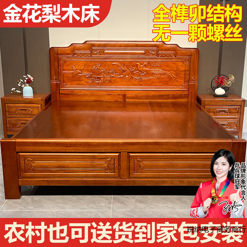 厚みのある金無垢材のベッド、ほぞ穴とほぞ穴のベッド、ダブルマスターベッドルームのウェディングベッド、中国風のアンティークパイナップル格子木製ベッド