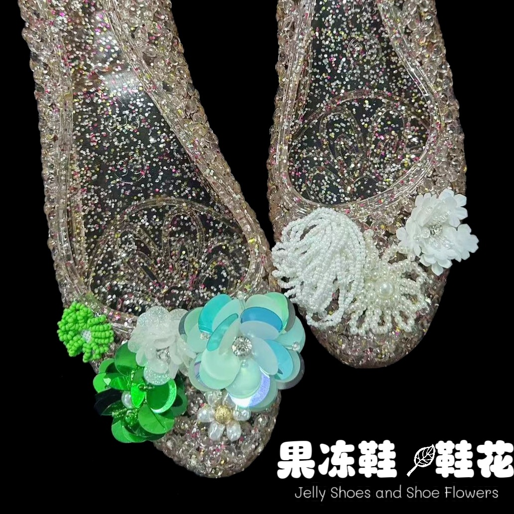 韓国の新しい靴、フラワーゼリー靴、アクセサリー、下駄、クリスタルシューズの装飾、夏の新緑のスパンコールシューズ